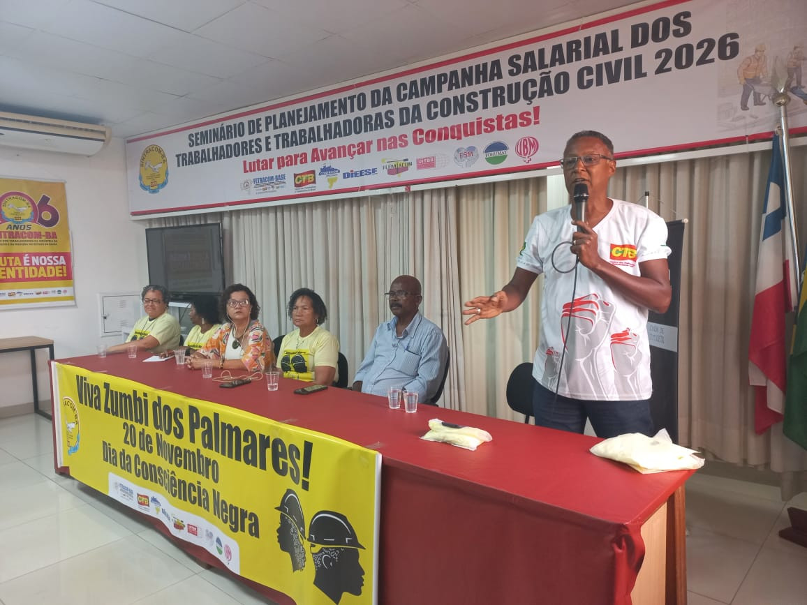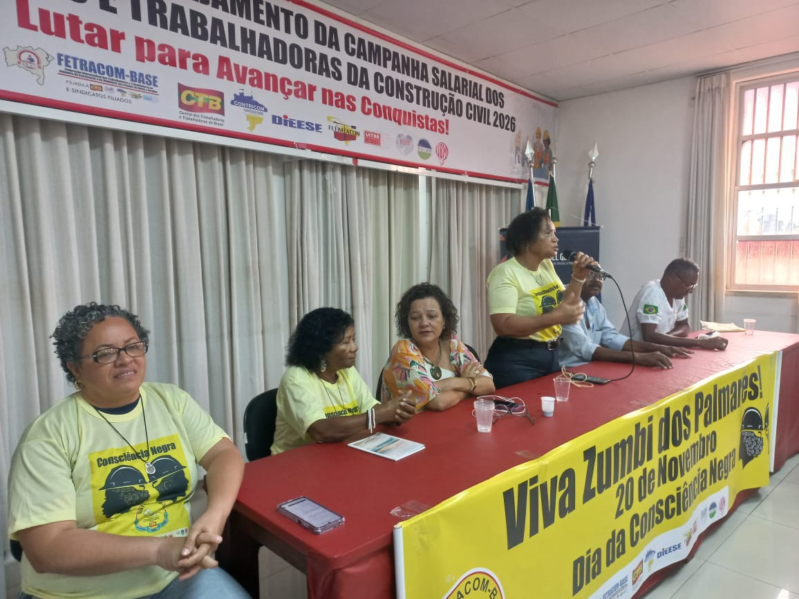 Para celebrar o Novembro Negro e o 20 de Novembro (Dia da Consciência Negra) dos trabalhadores e trabalhadoras da construção civil, o SINTRACOM-BA realizou, nesta quarta-feira (19), um debate que contou com a participação do secretário nacional de Políticas de Promoção da Igualdade Racial da CTB, Jerônimo Silva Junior, e a presidenta da CTB Bahia, Rosa de Souza, ao lado do vice-presidente do Sindicato, Amando de Jesus.
