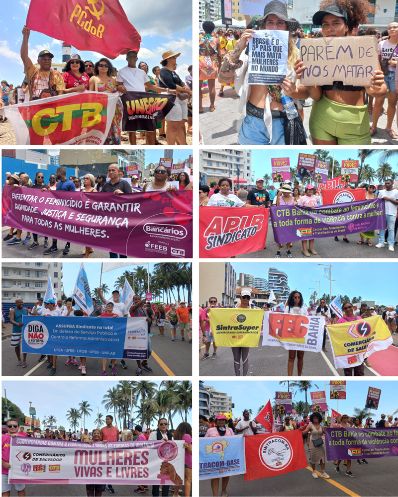 A CTB Bahia e vários sindicatos filiados reforçaram a atividade em Salvador. "Esse é um ato contra o patriarcado e a misoginia que estão matando milhares de mulheres. Além de mais políticas públicas específicas de segurança, mães e pais precisam ensinar nossos meninos e nossos jovens a respeitarem as mulheres. Nossa Central está firme ao lado das trabalhadoras e de todas as mulheres nessa luta", afirmou Arielma Galvão, dirigente da APLB e secretária de Políticas de Educação da CTB.